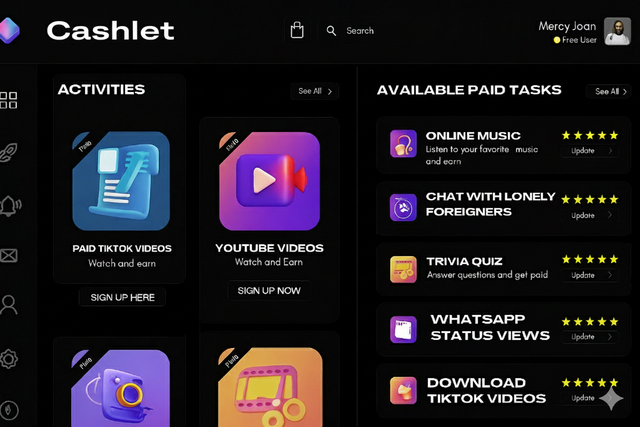 Cashlet is a premier platform that allows Active users to earn money online through various activities such as watching TikTok videos, watching YouTube videos, answering trivia questions, watching paid movies, with lonely foreigners, downloading TikTok videos, streaming musing online and paid WhatsApp status views.